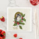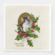 A Grey and White Christmas Kitten is framed in gold with holly and berries. Message: Christmas Greetings. Image of Vintage Postcard Graphic on a matching custom light yellow (off-white) background.