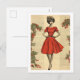 Send festive greetings with timeless charm using this vintage-inspired Christmas postcard featuring a classic mid-century illustration of an elegant woman in a vibrant red dress. Surrounded by holly branches and bright berries on an antique book-page background, this design blends retro fashion with nostalgic holiday warmth. Perfect for Christmas mailings, holiday party invitations, gift enclosures, or collectors who adore vintage ephemera and retro style. A stylish and heartfelt way to share holiday cheer.