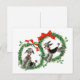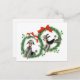 Cute retro Christmas postcard for poodle lovers- Two classic Christmas wreaths with holly berries, leaves and greenery and tied with red bows. In the center of each one is a playful black and gray poodle with red collars. In red, green, and white classic Christmas colors. Back is blank for you to leave your Christmas greeting.