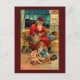 This adorable custom vintage postcard features Santa sitting on the couch setting out toys from his toy sack for the little girls to play with. A shabby calendar is hanging on the wall displaying December 25th and the words "Christmas Greetings" is displayed at the bottom of the card. The Christmas vintage image is set against an ornamental deep red Christmas background to make a lovely postcard.