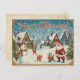 Colorful vintage Christmas postcard featuring a snowy village, Santa Claus, and a cheerful snowman. Perfect for sending festive greetings or as a collectible holiday keepsake.