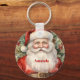 A keychain with a cute vintage style watercolor image. Santa Claus in his red suit with jolly cheeks and a smiling face. Surrounded by pine and holly.