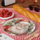 Paper plates with a cute vintage style watercolor image. Santa Claus in his red suit with jolly cheeks and a smiling face. Surrounded by pine and holly.