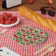 Vintage Christmas Stars and Bows Pattern paper plates. A seamless pattern featuring red and green bows intertwined with vintage-style stars. The background is a soft pink, creating a whimsical and nostalgic feel. The bows are detailed, showcasing their textures, while the stars have a classic vintage design, adding a playful touch. The overall composition should be harmonious, with the colours balanced to enhance the cheerful, festive atmosphere of the pattern.