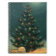 Vintage illustration Victorian Merry Christmas holiday design featuring a snowy landscape. A snowscape with a Christmas tree decorated with bright lights on a winter night with a starry night sky and snow on the ground. Happy Holidays and Season's Greetings!