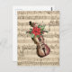 Festive Christmas design features vintage violin illustration with watercolor poinsettia bouquet on background of antique sheet music. Inside customisable text reads "May your holidays be filled with joyous sound"
