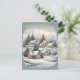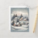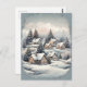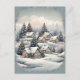 Vintage Christmas village in forest, winter season country old cottages with pine trees, snowflakes, retro muted colours
