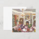 Vintage illustration Merry Christmas holiday design featuring the interior of a house living room with a mirror over the fireplace, furniture and a chandelier. This cosy room is strewn with gifts, wrapping paper and ribbon on Christmas Eve. A cute kitten cat is sleeping on an ottoman.