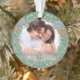 Decorative and ornate family portrait ornament. A green lace wreath decorated with baubles frames your photograph with delicate snowflakes dotted over your photograph. Personalize on the reverse with a Christmas message for a gift or as a family keepsake.
