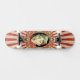 A unique and eye catching vintage skateboard design with a circus clown surrounded by a red and beige distressed sunburst stripes pattern. The stripes and clown image have a trendy worn look.