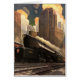 Vintage illustration travel and transportation image featuring a locomotive railroad train travelling through the downtown city buildings in Philadelphia, Pennsylvania. An urban architectural cityscape. A T1 Duplex train. Artist: Alexander Leydenfrost.