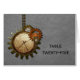 This unique Vintage Clock Table Number Card in light gray features antique steampunk clocks and gears hanging by a metal bead chain. The background has a textured paper and mesh overlay which adds a distressed and grungy feel to the design. This quirky and offbeat wedding table number card would be perfect for a steampunk inspired wedding. Easy to customize, simply add the appropriate table number(s) in the space provided. Click on the "Customize It" button to find additional personalization options.