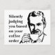 Funny slogan "Silently judging you based on your coffee order" with sophisticated judgmental chap sipping his drink.