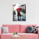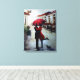 Replica wrapped canvas painting of a couple in love holding red umbrella in Mediterranean city with a small Scottish Terrier