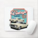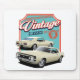 This is a rendering of an American classic muscle car with vintage graphics in the background for a retro styled look.