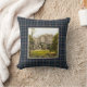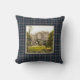 Throw pillow with a vintage photo lithograph of Culzean Castle in Scotland from 1895 pictures a large castle with a greenhouse and garden in the foreground. Digitally cleaned, enhanced and artistically rendered to resemble pen and ink with watercolors. Framed and backed with the Clan Kennedy ancient tartan, a traditional Scottish plaid pattern in shades of light green and blue, with purple and yellow highlights.