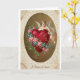 This design shows a vintage-style Cupid resting on a deep red heart, looking outward with a sweet, knowing expression 🥰. The Cupid has soft golden curls and pale pastel wings, and his relaxed pose makes the scene feel gentle and affectionate. The heart is covered with flowers, including light pink roses, small blue forget-me-nots, and trailing green ivy. A gold arrow runs through the heart, and tiny gold specks seem to scatter across the aged, crackled gold background. Around the scene is a creamy border with raised, curling details, plus light sepia marks that make it feel old and well kept. There isn’t any readable text on the front, so the picture does the talking and leaves room for your own words inside ❤️. It feels meaningful to give because it nods to classic romance and reminds someone they’re cared for in a simple, lasting way.