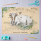 Vintage image of dairy cow laying on blue flowers with vintage Northstar Tea Co. advertisement in background. Blue flowers in each corner as well. Perfect for furniture decoupage for farm lovers!