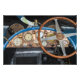 Beautiful polished copper with various vintage gauges behind a wooden steering wheel.