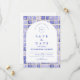 A timeless blue and white design inspired by classic Delft porcelain and French toile patterns. The patchwork tile border combines delicate florals, stripes, and ornamental motifs that evoke vintage European ceramics. A soft arched panel in the centre keeps the layout refined and elegant while allowing the details of the porcelain-inspired pattern to frame the celebration beautifully. Perfect for couples planning a sophisticated blue and white wedding with traditional European charm.