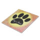 Cartoon dog pawprint in black. Vintage style background with aged paper effect.