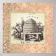 Pretty square poster that features an antique illustration of a domed beehive on a pedestal with a distressed pink and gold damask background