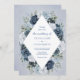 A chic vintage invitation displaying your wedding details inside a white diamond element surrounded by lush flowers in shades of blue, navy and white, all on a warm dusty blue watercolor background. The card reverses to a small floral arrangement in the centre. This invitation is part of a beautiful matching wedding suite that can be fully personalised.