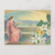 An angel surveys a landscape with Easter lilies. Text says "May thine be a happy Easter". This was originally an Easter card from 1910. Courtesy of New York Public Library public domain holiday card collection.