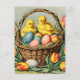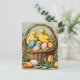 Cute old-fashioned Easter chicks are sitting in an egg-filled basket with vibrant tulips all around. Personalise the other side of this postcard with the details of your party .