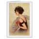 A vintage illustration by Tito Corbella is a portrait of a beautiful young flapper with short, dark curls. She wears a beaded headband and red lipstick. Her dress is black with bare shoulders, arms and back, and she holds a red flower up to her chest. The artist, Tito Corbella (1885-1966), was born in Pontremoli, Italy and died in Rome, Italy. He signed his artwork as “T. Corbella” and was most famous for his Italian art deco style. His love of beautiful women, fashion and glamour is evident in the more than 300 images he painted which were often used on postcards. This card is blank inside for your own message.