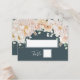 Wedding table place setting cards with elegant cream, white, and blush watercolor flowers, pastel greenery and a navy blue background.