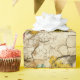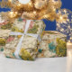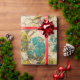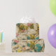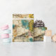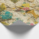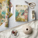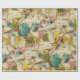 A richly layered pattern wrapping paper featuring vibrant floral motifs in teal, yellow, and pink over a distressed, cracked parchment background. The design blends botanical illustrations with mixed-media collage elements, faint typography, and textured paper folds, creating an antique, weathered aesthetic.