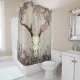 A fierce deer skull graphic with flowers and peacock feathers in its antlers mounted against a sepia-hued, vintage floral background, framed by tribal patterns.