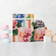 This vintage floral stripe gift wrap features hand-painted blooms layered over soft pastel stripes for a cheerful, garden-inspired look. Blush pinks, warm yellows, and rich blues are balanced with lush green leaves, creating a design that feels joyful, artistic, and timeless.