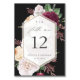 A romantic, vintage floral table number card featuring beautiful rich plums and pale pink rose botanical with a modern geometric shape and rose gold frame and couple monogram.