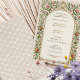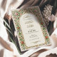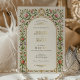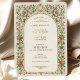 This vintage-inspired wedding invitation features a delicate floral border adorned with pink and red roses, purple blossoms, and lush green leaves. Ornate golden accents and a soft cream background add an elegant touch, creating a timeless and romantic aesthetic. The intricate details and classic typography make this design ideal for couples seeking sophisticated, floral-themed wedding stationery with a vintage charm.