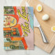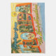 Vintage Florida postcard illustration: Greetings from Florida, The Land of Sunshine. The letters are filled with images from old Florida and the retro colors background are rich with historic Florida kitsch.