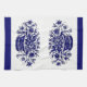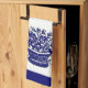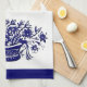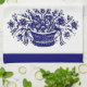 A towel with a vintage woodcut etching of a rustic bouquet of daisies and other flowers in a basket in deep blue with blue borders on white.