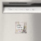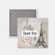 A thank you magnet with a pretty collage of painted flowers and vintage postmarks with a black illustration of the eiffel tower. Charming and chic design.