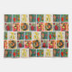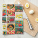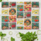 Vintage food labels in repeat pattern on colourful kitchen towel.