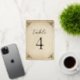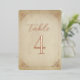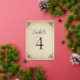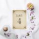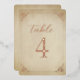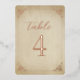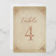 These custom wedding table number cards feature a vintage, elegant design. The table cards have a parchment paper style background and are framed with a rustic, vintage style antique frame. The frame is printed in real rose gold foil that matches the table number. The text is printed in an elegant script font.