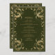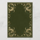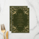 This elegant wedding menu features an ornate vintage gold frame on a faux textured olive green background in imitation of an antique book cover. Customise the decorative gold-coloured text with your menu details. The frame design is repeated on the back of the card.