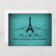 Grungy yet elegant Vintage French Flourish Save the Date Postcard in turquoise featuring an Eiffel Tower design embellished with chic swirls and dots and a faux paper textured background. This unique Parisian themed save the date postcard would be perfect if you are planning a destination or simply a french inspired wedding. Easy to customise, simply add the details of your wedding in the fields provided. Click on the "Customise It" button to find additional personalisation options.