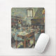 This design features a painting by the French Neo-Impressionist artist Maximilien Luce (1858–1941). It is a view of a traditional kitchen in a grand French house. There are two female culinary staff in the kitchen. One woman is seated as she cuts vegetables. The other woman is standing as she washes and dries plates. There is a large wooden table in the centre of the kitchen, and there are many cabinets and utensils around the outside of the room. There is a small window in the corner of the kitchen, letting in light as the women work. The original art was painted in 1889.