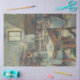 This design features a painting by the French Neo-Impressionist artist Maximilien Luce (1858–1941). It is a view of a traditional kitchen in a grand French house. There are two female culinary staff in the kitchen. One woman is seated as she cuts vegetables. The other woman is standing as she washes and dries plates. There is a large wooden table in the centre of the kitchen, and there are many cabinets and utensils around the outside of the room. There is a small window in the corner of the kitchen, letting in light as the women work. The original art was painted in 1889.