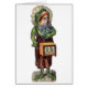 A vintage illustration of a female frog dressed in a skirt, white lace cap and a big bow at her neck. She is an organ grinder and plays an organ box as she tilts her head back to sing along. The card is blank inside for your own message.