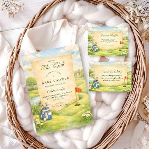 Celebrate a new little member joining The Club with this charming vintage storybook baby shower design. Inspired by classic illustrated golf scenes, it features soft watercolor landscapes, a whimsical flag on the green, and refined old-world details that feel timeless yet playful.