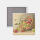 An illustration of a wicker basket with red and green gooseberries spilling out and a bee or wasp flying above, on a dark cream or beige background, from a vintage painting by artist Catharina or Catherine Klein, born 1861.