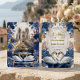 Set the tone for your formal evening union with this sophisticated design featuring romantic swans, deep royal blooms, and elegant vintage typography.This design features a digital illustration of two graceful white swans curving their necks to form a heart shape, set against a backdrop of a faint, ethereal gothic cathedral arch. The swans are nestled in a lush arrangement of deep navy and royal blue roses accented by autumn bronze and brown leaves. The couple's names are displayed in a bold, vintage Blackletter font, while the details appear in a refined script, both simulating a shimmering metallic texture against the dark background.