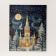 A beautiful vintage art 16x20 jigsaw puzzle for the serious puzzle person, featuring a seasonal vintage Gouache styled puzzle with a church and pines in a woodland nighttime setting for the holiday season.